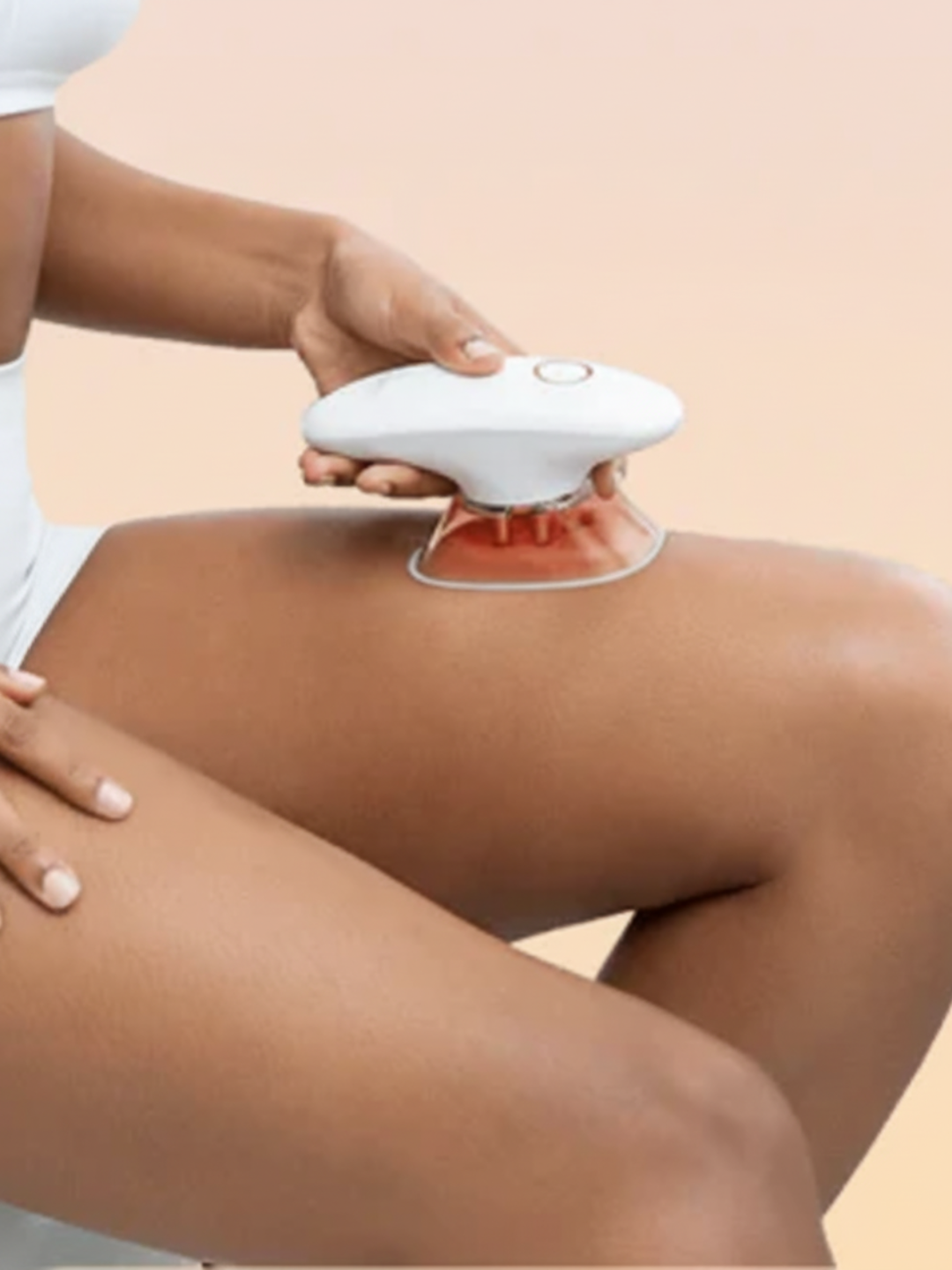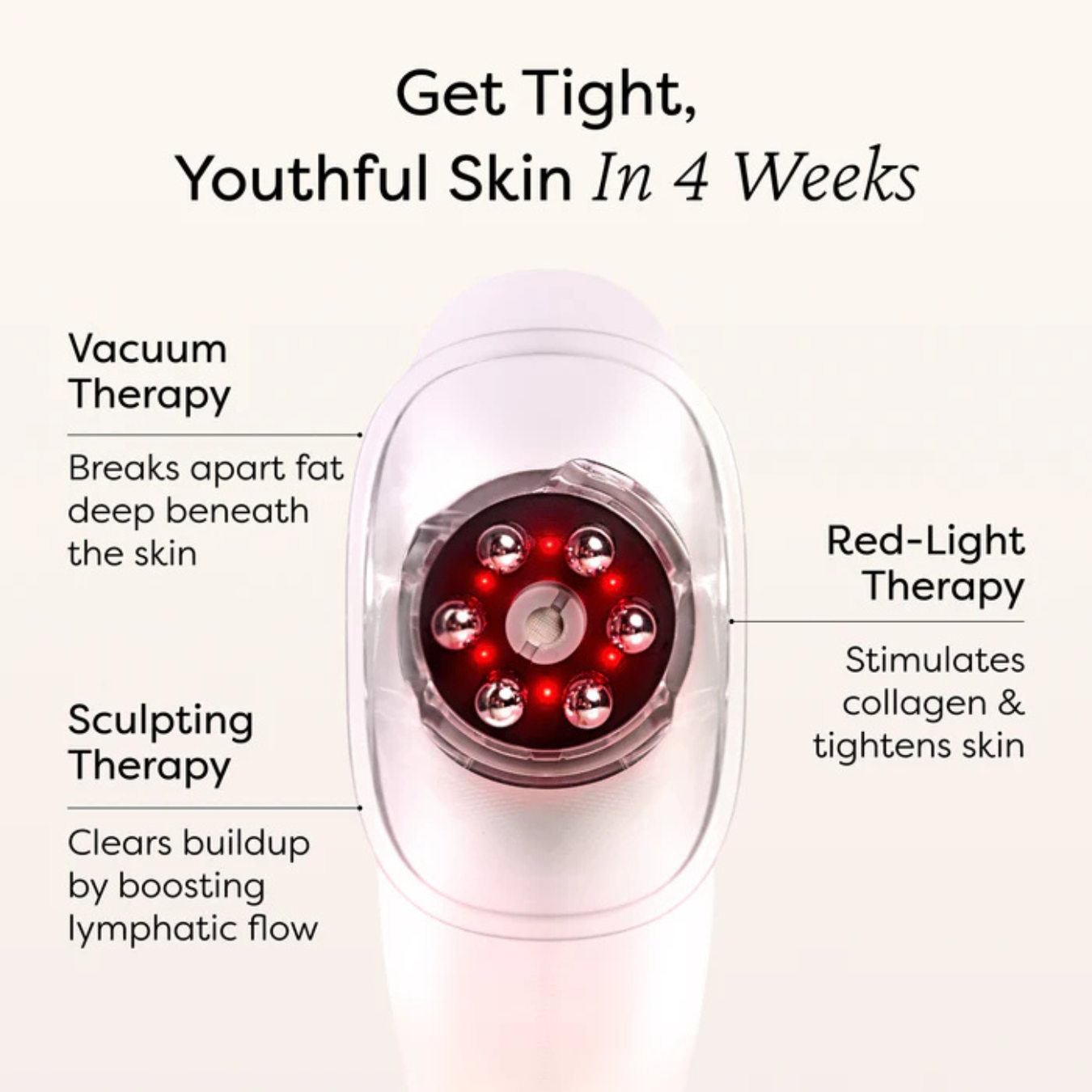 Gently glide the SculptCura™ device over the oiled area using slow, upward motions. The combination of Vacuum, Sculpting, and Red-Light Therapy helps tone, firm, and contour in just 5–15 minutes per session.